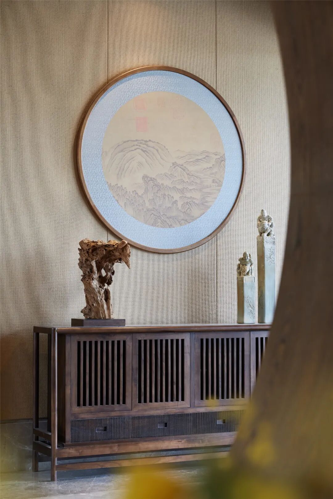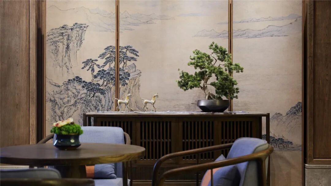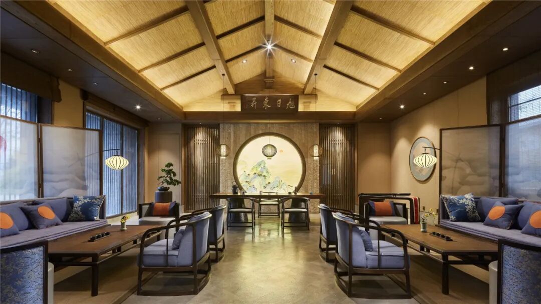 天台山旅游区游客服务中心茶室,古而不拙,室内方圆之间,古朴装饰,在轻盈的空间中压下深沉一笔,茶禅一味,幽静而不失雅致,是品茶好去处。