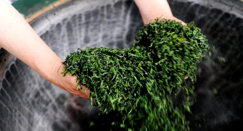 天台山绿茶半炒半烘,以炒为主,仍以手工方法制作,经鲜叶摊放,高温杀青,煽热摊凉,轻加搓揉,初烘失水,煽热摊凉,入锅炒制,低温烘焙,稍凉装箱等工序制成。