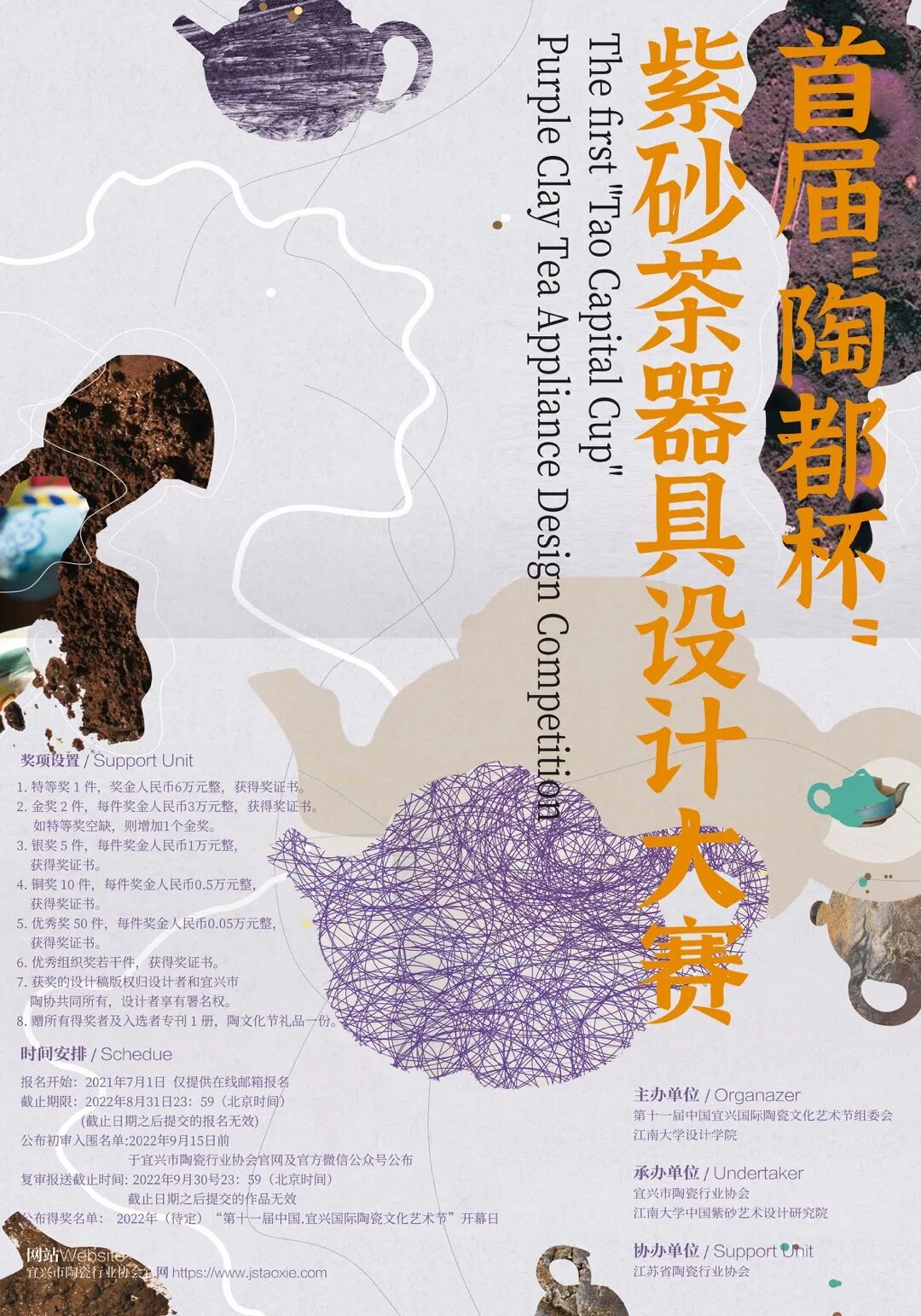 尊敬的各位参赛选手:随着多地区疫情形势的不断严重,为做好疫情防控工作,保障全体参赛人员以及评委老师们的身体健康,经主办方研究决定,原定于2022年4月举行的“首届“陶都杯”紫砂茶器具设计大赛”评比活动将延期举行。由第十一届中国宜兴国际陶瓷文化艺术节组委会、江南大学设计学院主办,宜兴市陶瓷行业协会和江南大学中国紫砂艺术设计研究院承办的首届“陶都杯”紫砂茶器具设计大赛评选活动自2021年7月1日启动以来,来自全国各地的设计师踊跃参与,关注度持续上升,为了进一步提升比赛的丰富性,扩大比赛的影响力,经研究决定,将比赛的报名截止时间延迟至2022年8月31号,同时主办方也会加大宣传力度,立足紫砂茶器具造型,开启面向全世界的设计征集,欢迎广大设计工作者积极报名,踊跃参与,继续延升紫砂茶器具的魅力!
