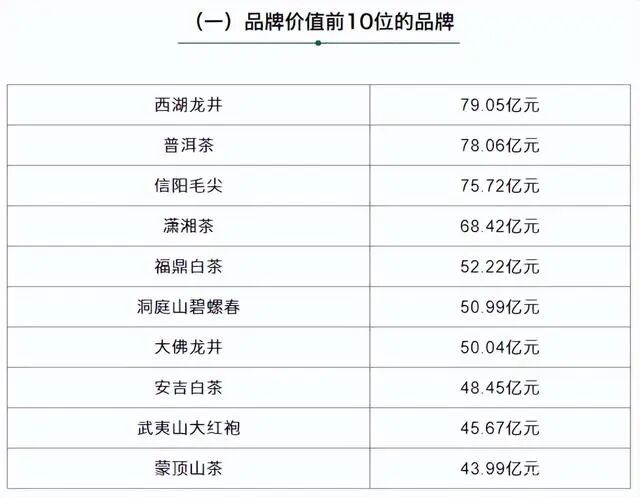 据“2022中国茶叶区域公用品牌价值评估”研究结果显示,大部分茶叶区域公用品牌的价值建设迈向了新的台阶,品牌价值十强榜单前十名均超过40亿元。其中,西湖龙井、普洱茶、信阳毛尖分别以79.05亿元、78.06亿元、75.72亿元位居前三。