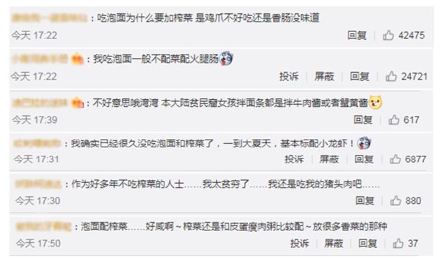 黄世聪的言论传到大陆,微博上有网友表示:吃泡面加榨菜我还是头一次听说↓