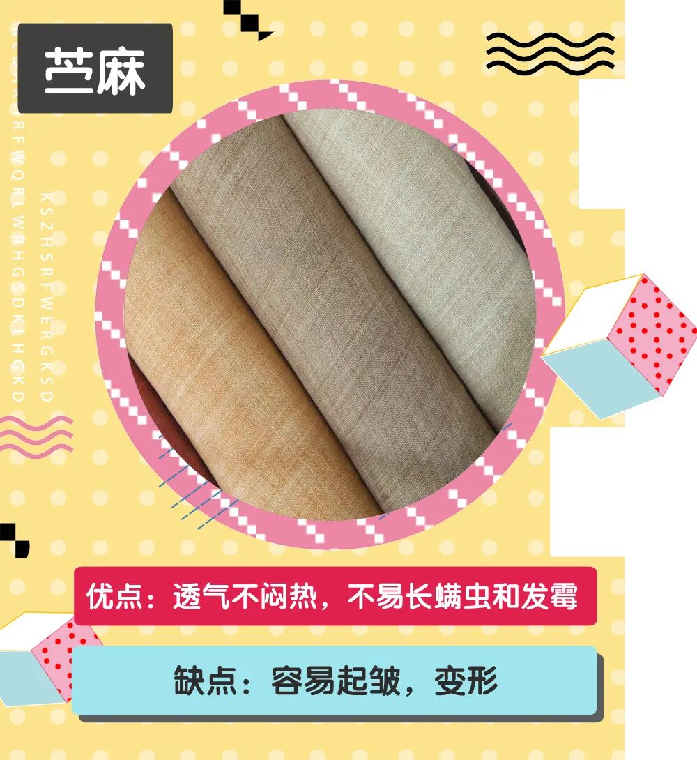 苎麻:优点:透气不闷热,不易长螨虫和发霉、清洗方便