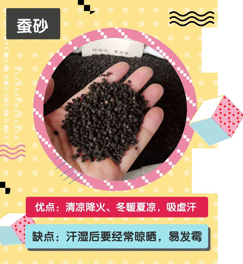 蚕砂:主要由蚕沙(蚕食桑后排泄出来的粪便)辅助以其他中药,制成枕芯,在使用时,头温及头部的压力使枕内药物有效成分缓缓散发,清凉降火,冬暖夏凉,还能吸虚汗,幼儿可以防起疹,《本草纲目》中记载,蚕沙有祛风降湿、明目降压等功效。