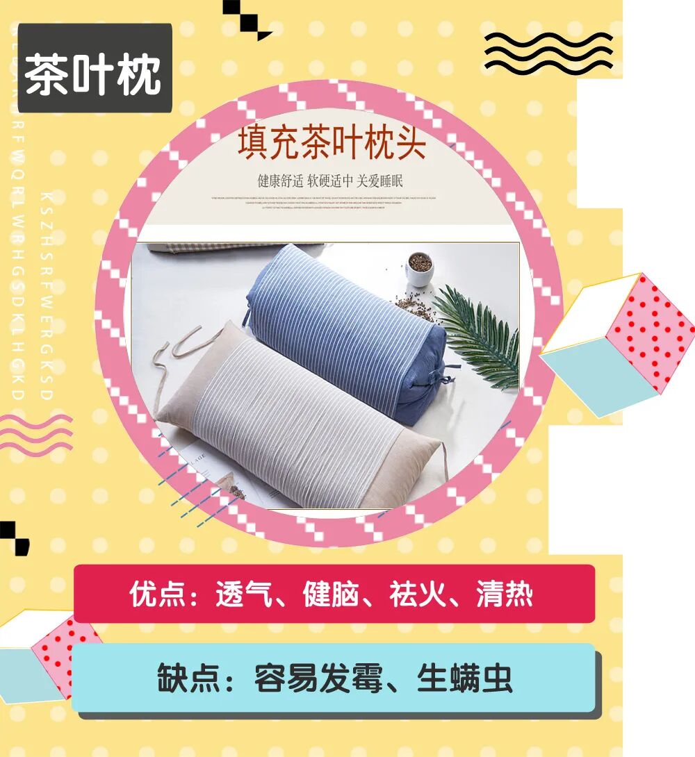 茶叶:茶叶枕的枕芯由经过消毒、加工泡制而成的茶叶作为填充物。茶叶枕有健脑、祛火、清热解毒、解暑等功能。比较适合小婴儿夏天使用。