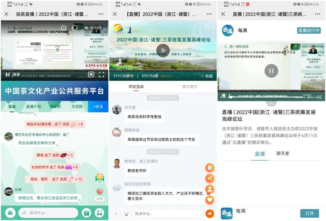 北京茶世界资讯:为了贯彻落实习总书记“三茶统筹”的发展理念,弘扬茶文化、做强茶产业、发展茶科技,提升西施石笕茶品牌影响力,由中国茶叶学会、诸暨市人民政府联合主办的“2022中国(浙江·诸暨)三茶统筹发展高峰论坛”于4月11日在浙江省诸暨市成功召开。此次会议以“云直播”的形式进行,通过中国茶叶学会视频号、抖音、快手、今日头条、西瓜视频、微博,说茶传媒,中华合作时报·茶周刊,湖南电视台茶频道,科创中国·科技工作者之家,茶道新生活,茶阅世界,每日商报等十多个平台同步直播,累计观看逾80余万人次。