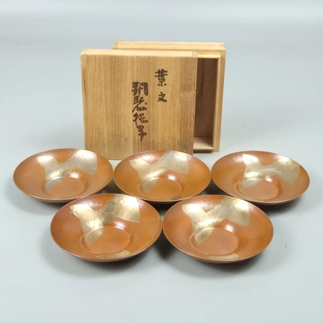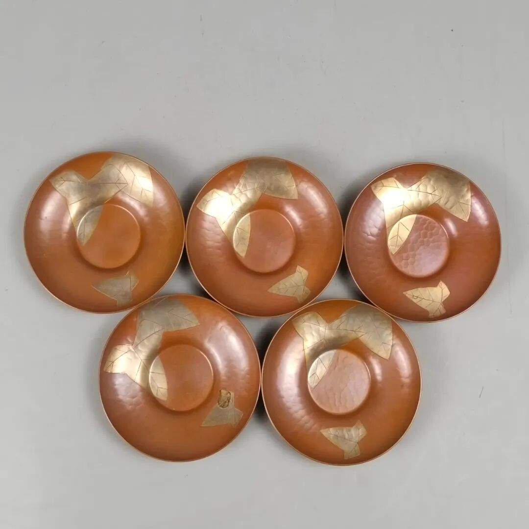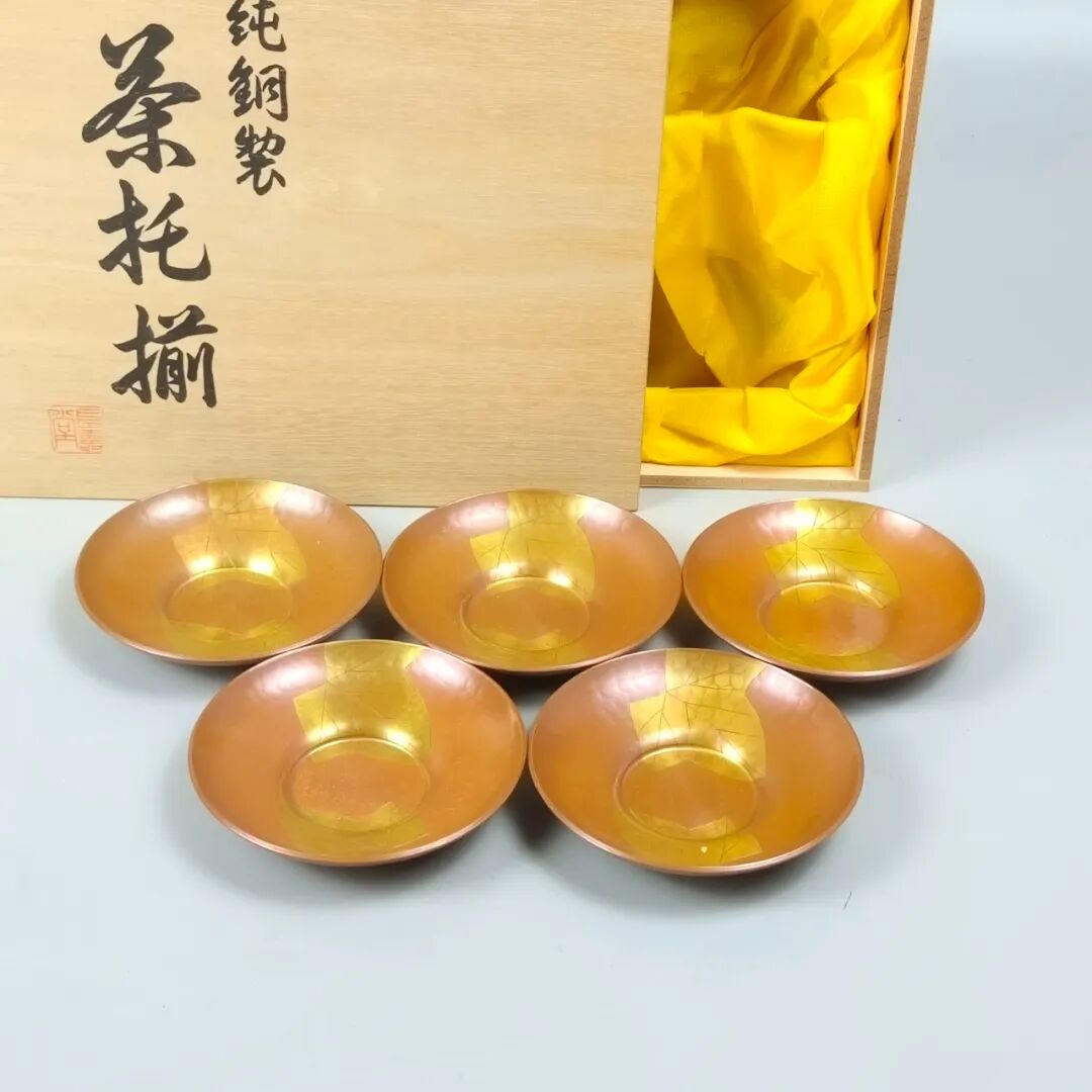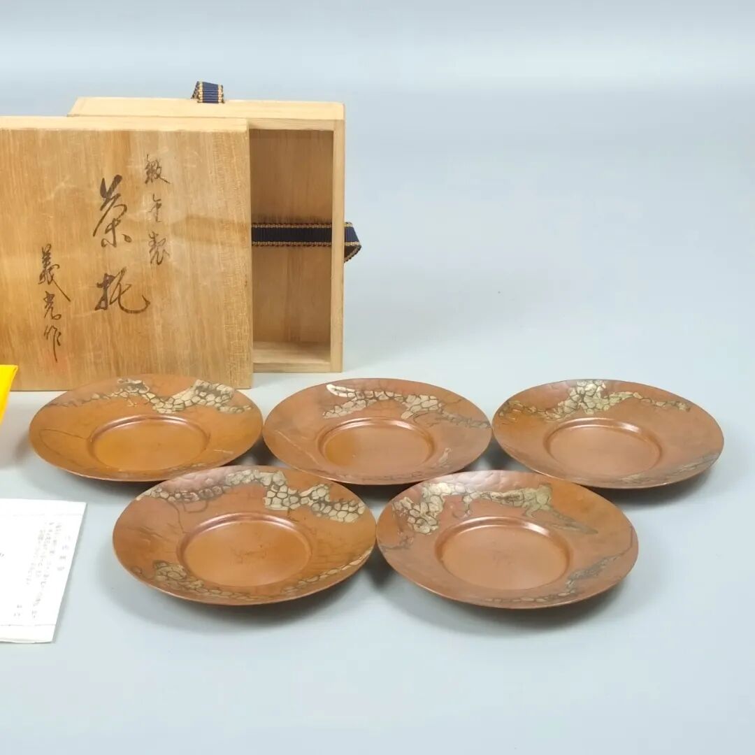 日本玉川堂造金彩叶文日本铜茶托一套5个。
