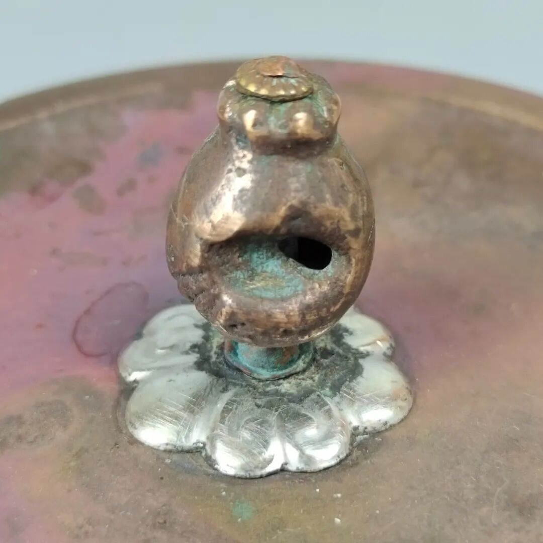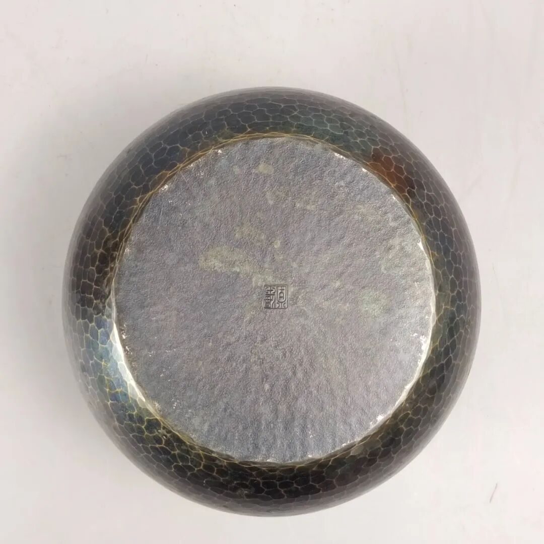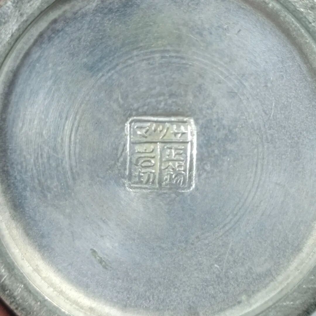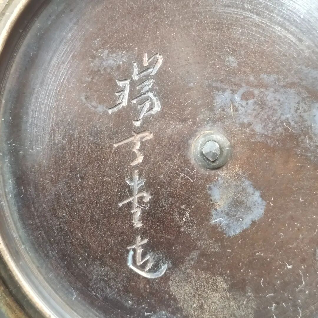 斑紫铜盖,虫蚀纹摘,纯银摘托。状态良好。