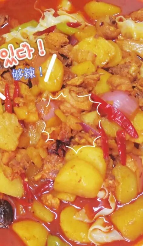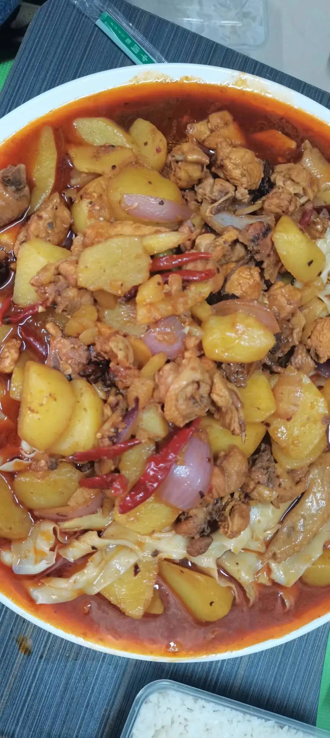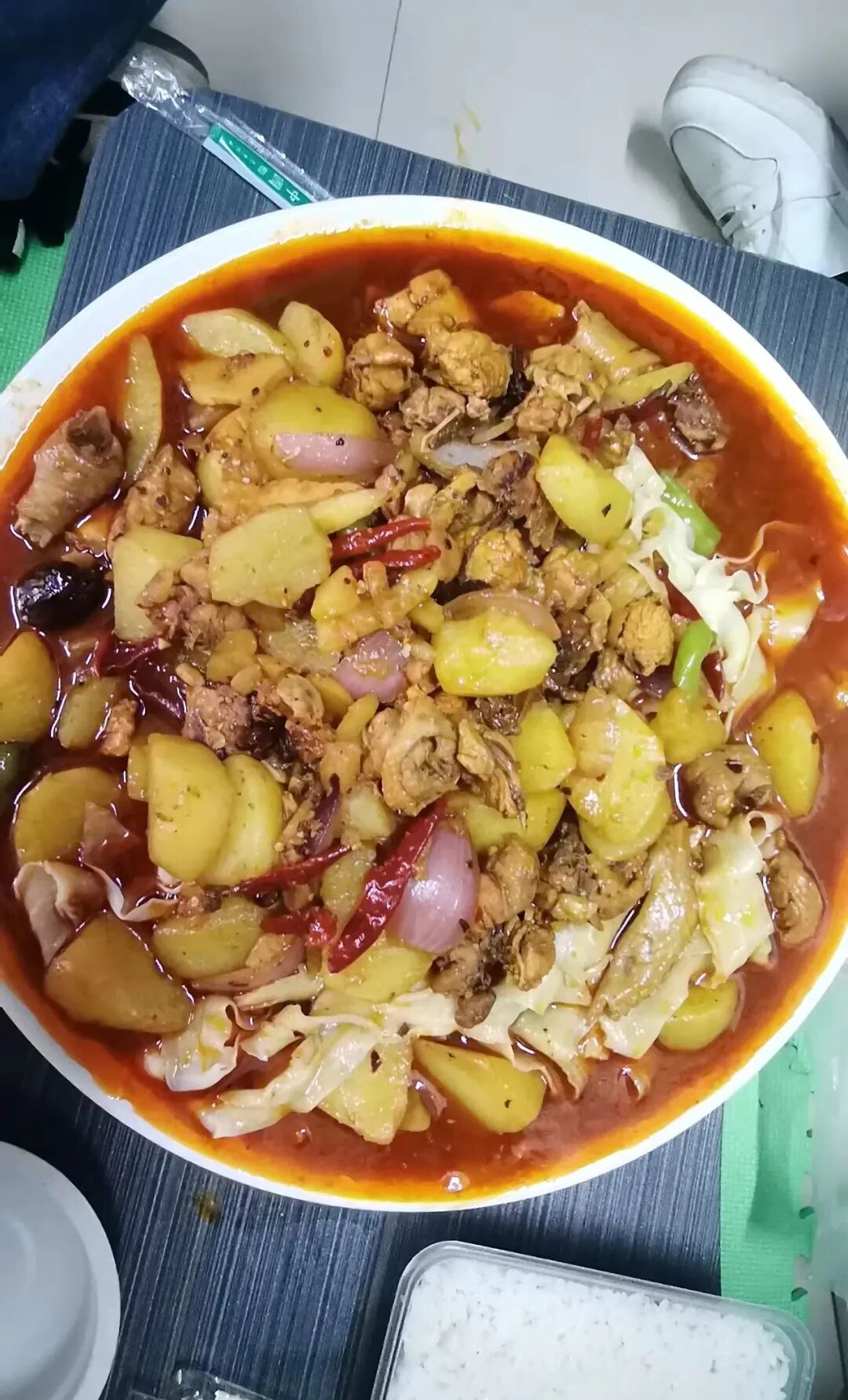 耶,周六中午吃了心心念念的大盘鸡,真开心,其实是室友在人家的朋友圈里看到了,他们去野餐买了大盘鸡,看上去真不错,还有盘子,感觉好有食欲呀,经过多方打听,(哈哈哈哈哈,果然是吃货),问到了人家是在兰州拉面点的大盘鸡,一份80,超大一份,找了同学拼单,四个人买一份,我和另一个室友帮忙刷指纹,一人刷两个,四个人平摊才9.5元,还买了两盒米饭,老板送了一份面,为了有仪式感我们找老板借了他们的大盘子,回宿舍吃,天呐,太好吃了,那个汤汁好下饭啊,nice,土豆是甜甜的,刀削面浸满了汤汁,青椒和洋葱的味道好香,绝绝子,本以为四个人一份吃不完,没想到低估了自己,全部解决!建议大家可以去试试,他家的炸鸡腿也好诱人呐,茶叶蛋也好香,啊,想吃!