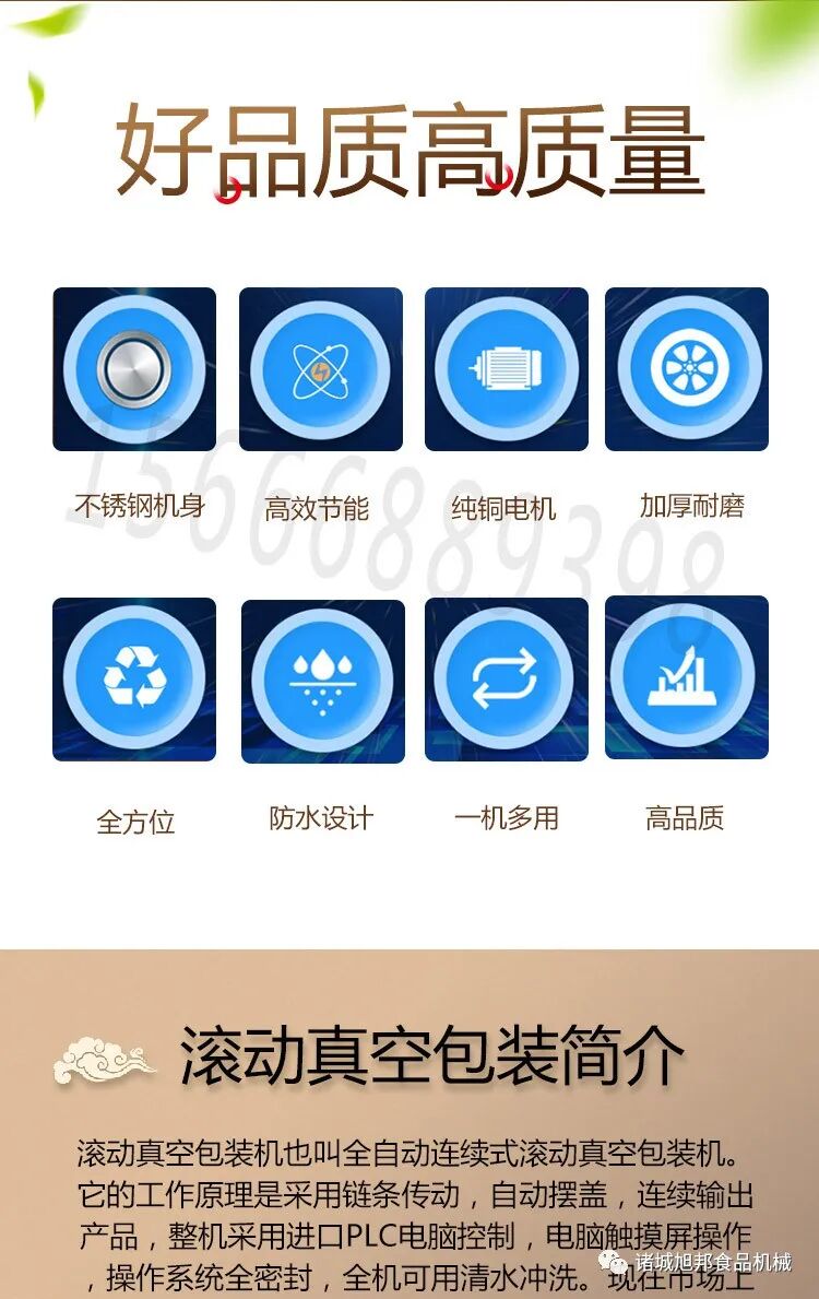 2、滚动式真空包装机的传动件采用连杆装置和精密分度结构等全机械结构,由于是低速运行,保证了机器的稳定性和耐用性。精密分度结构使输送带步进更加准确,并且每转动一周会自动消除误差,明显优于同类机器。