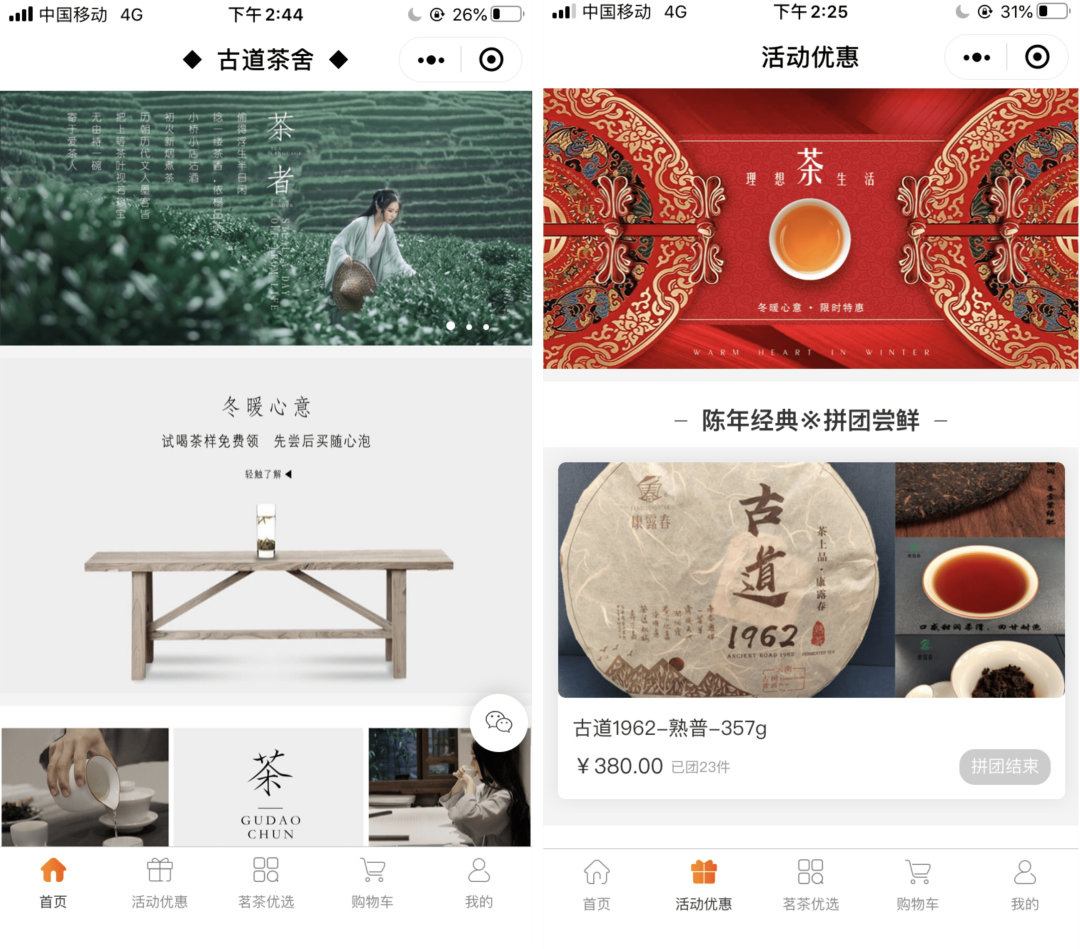 在前期营销过程中,「古道春茶业」通过及社群对内容营销进行优化,提供优质内容输出,为品牌影响力提效加成,并通过商城搭建小程序交易平台。