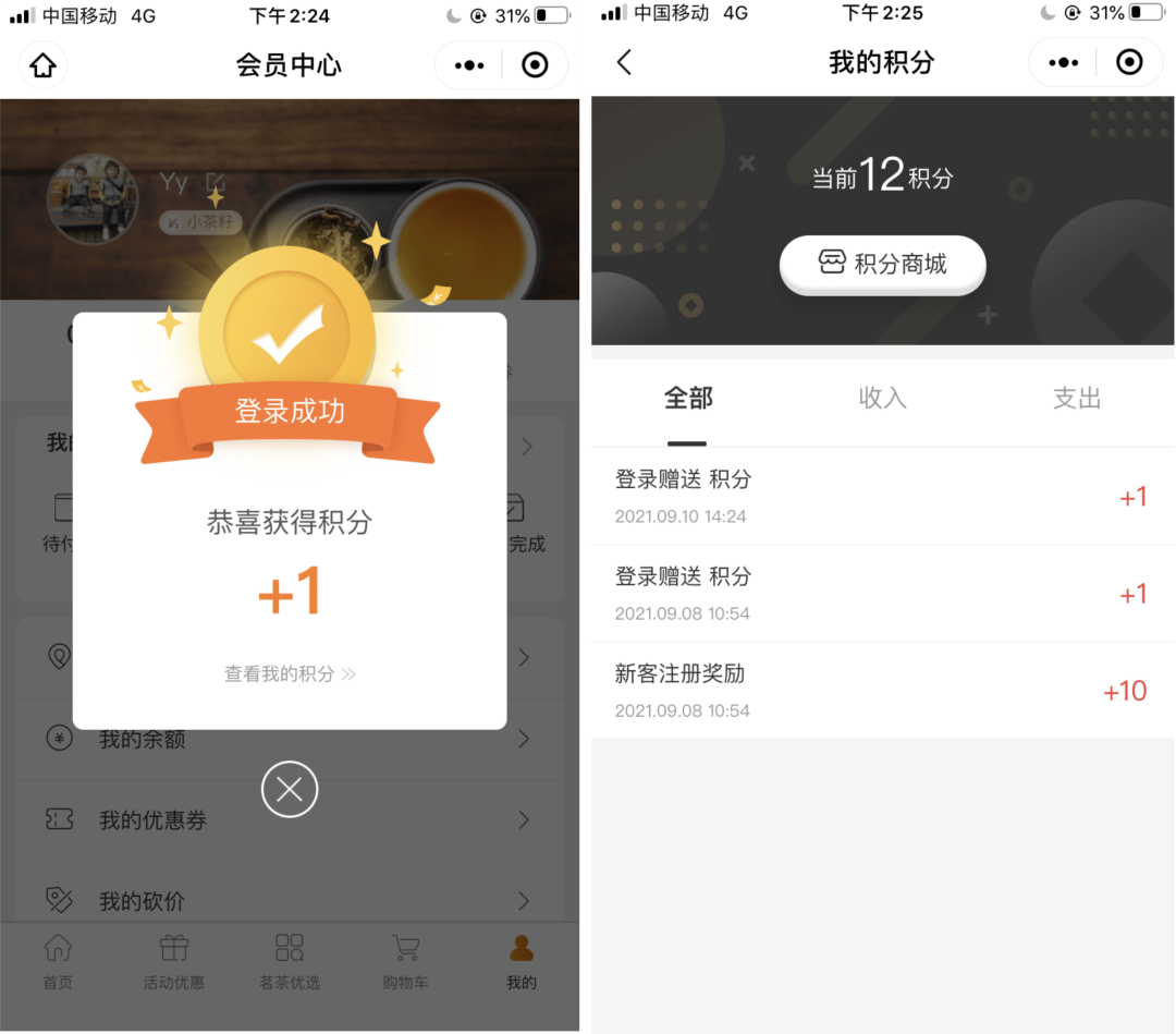 「古道春茶业」会员按积分升级,积分升级不仅仅看交易,同时还看会员活跃度。注册、登录、消费、评价等都可获得一定积分。积分不仅可以升级获得折扣,还能用来抵现和换购礼品,有效促进销售转化。
