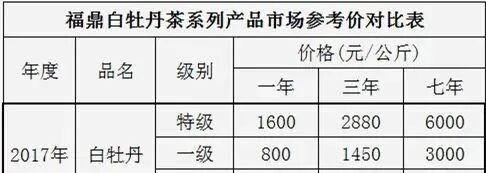 由于白茶有:“一年茶、三年药、七年宝”的特殊性,年份越高的白牡丹茶价格也就越高。接下来,将从白牡丹茶等级及年份的角度来给大家分享下福鼎白牡丹茶价格。如下图所示,2018年福鼎白茶市场上的白牡丹茶参考价格如下:“|1年二级白牡丹茶价格为400元一斤,3年二级白牡丹茶价格为700元一斤,7年二级白牡丹茶价格为1400元一斤;1年一级白牡丹茶价格为700元一斤,3年一级白牡丹茶价格为1200元一斤,7年一级白牡丹茶价格为2500元一斤;1年特级白牡丹茶价格为1200元一斤,3年特级白牡丹茶价格为2050元一斤,7年特级白牡丹茶价格为4300元一斤。”