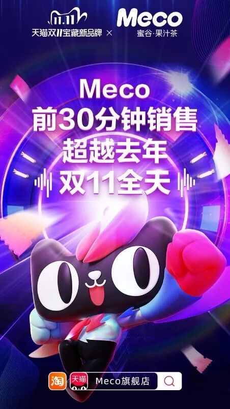 2020年4月18日,在Meco蜜谷天猫官方旗舰店,新品“樱桃莓莓”火爆上市秒售罄;4月25日,该果汁茶走进带货一哥李佳琦的直播间,6万余箱新品瞬间抢购一空;11月1日,Meco蜜谷果汁茶前30分钟销售额超越上一年双十一全天.......