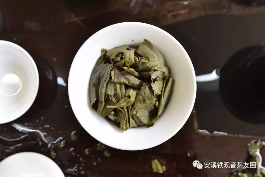 观:优质铁观音茶条卷曲、壮结、沉重,呈青蒂绿腹蜻蜒头状,色泽鲜润,砂绿显,红点明,叶表带白霜。茶叶冲泡展开后叶底肥厚明亮(铁观音茶叶特征之一叶背外曲),具绸面光泽最好,汤色暗红者次之。