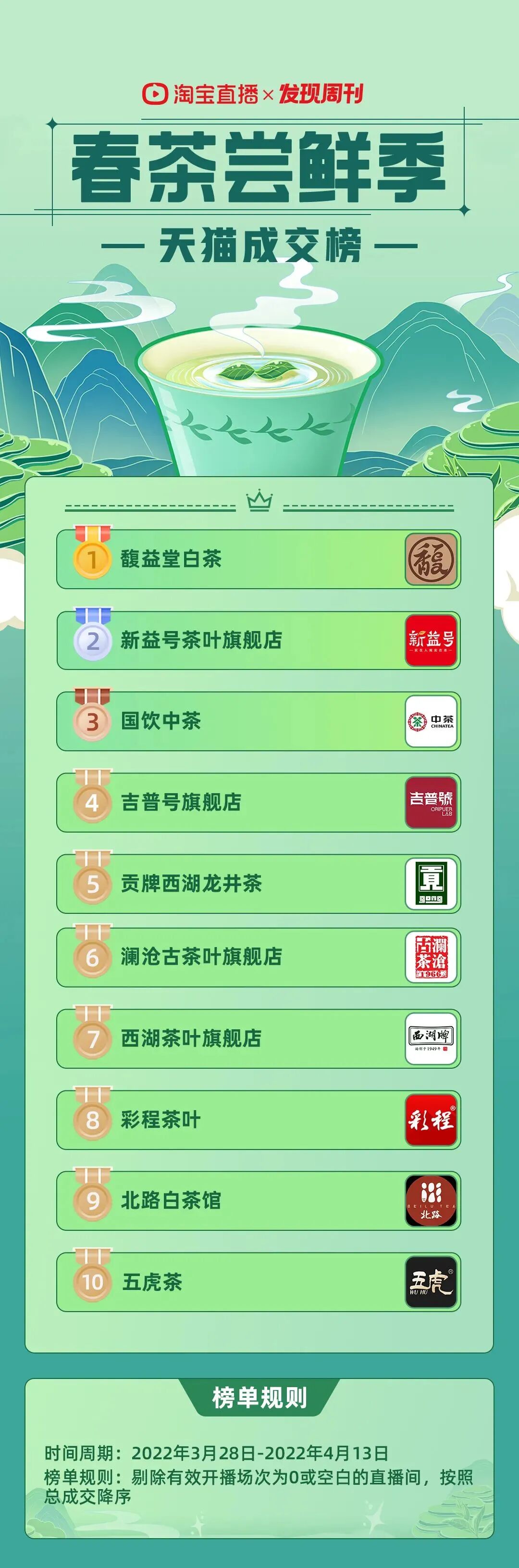 4月,春茶正式上市,淘宝直播发起了【淘宝直播·发现周刊】“春茶尝鲜季”的品类营销活动,活动中我们发现茶叶品类总体呈现上升的趋势,越来越多的茶叶商家开始利用直播拓展自己的销售渠道。淘宝直播根据2022年3月28日-4月13日期间,平台茶叶品类直播数据,推出了《2022淘宝直播“春茶”报告》。直播间学知识