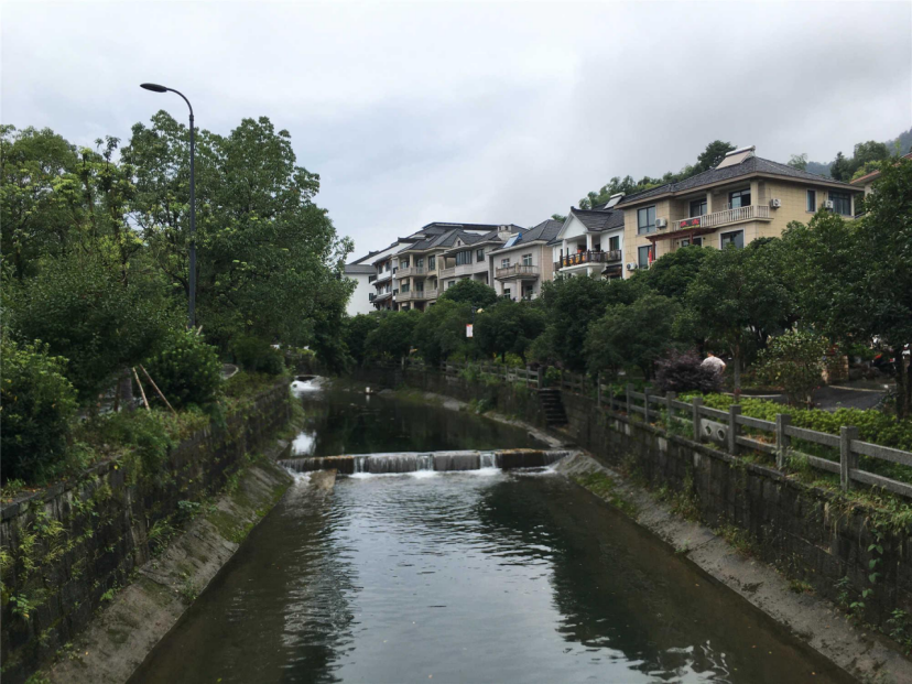 溪水从民居前面流过,民居后面是山,种植茶叶。