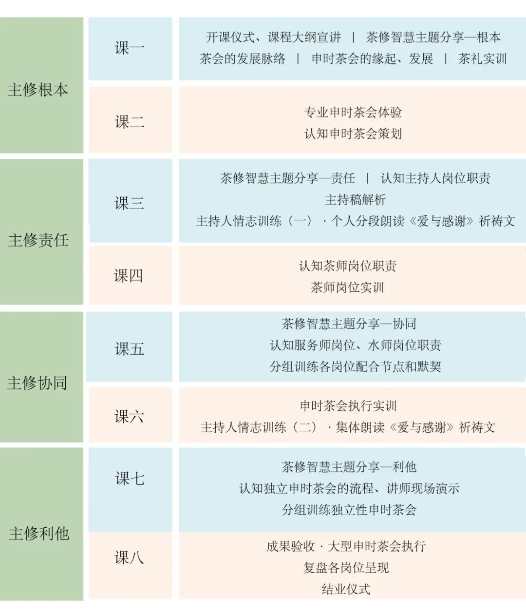 茶会+修,共修中每天一个智慧主题,用一杯物质的茶贯通精神修为,在掌握技能的同时感知内在,实现内外同行