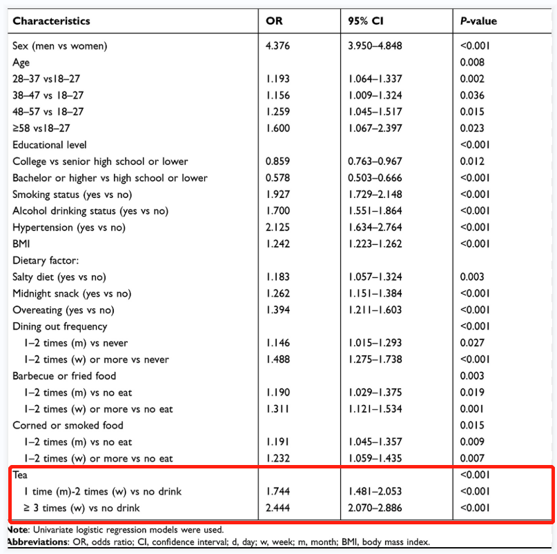 而作者在文末也坦言本次研究的局限性,包括本研究是单中心横断面研究,尽管样本量较大,但仍然存在偏倚可能;其次,本研究数据的获得主要通过喝“茶”频次的问卷调查,并未对茶叶含量多少等因素进行精确的度量;再次,患者基础疾病、服用药物情况等可能干扰尿酸的因素在本研究中并未进行探讨。