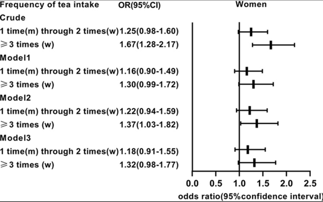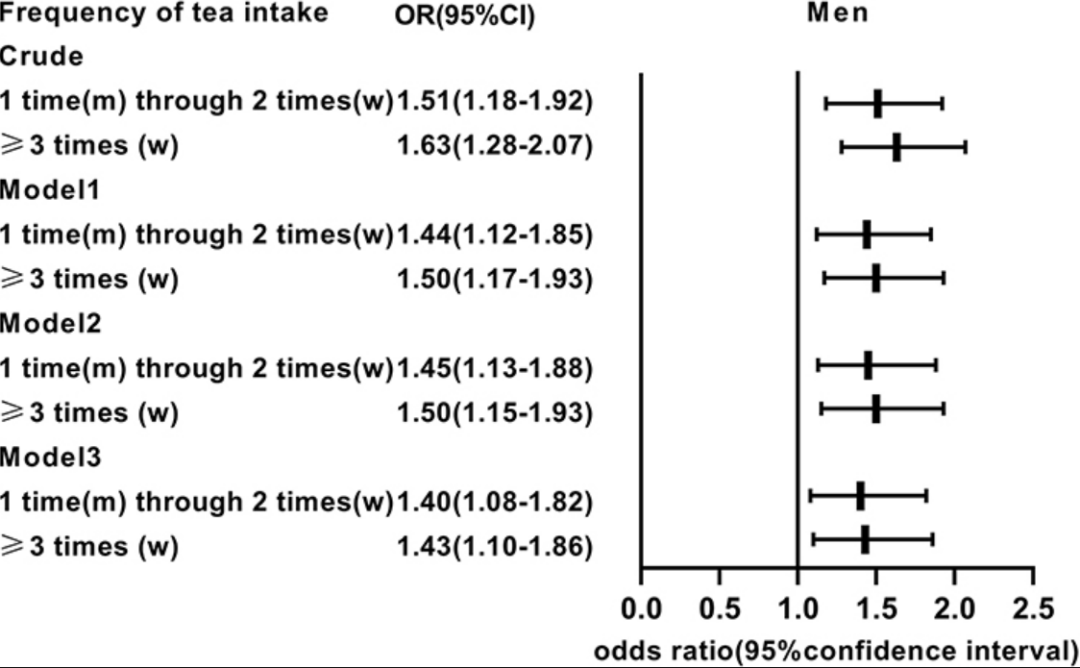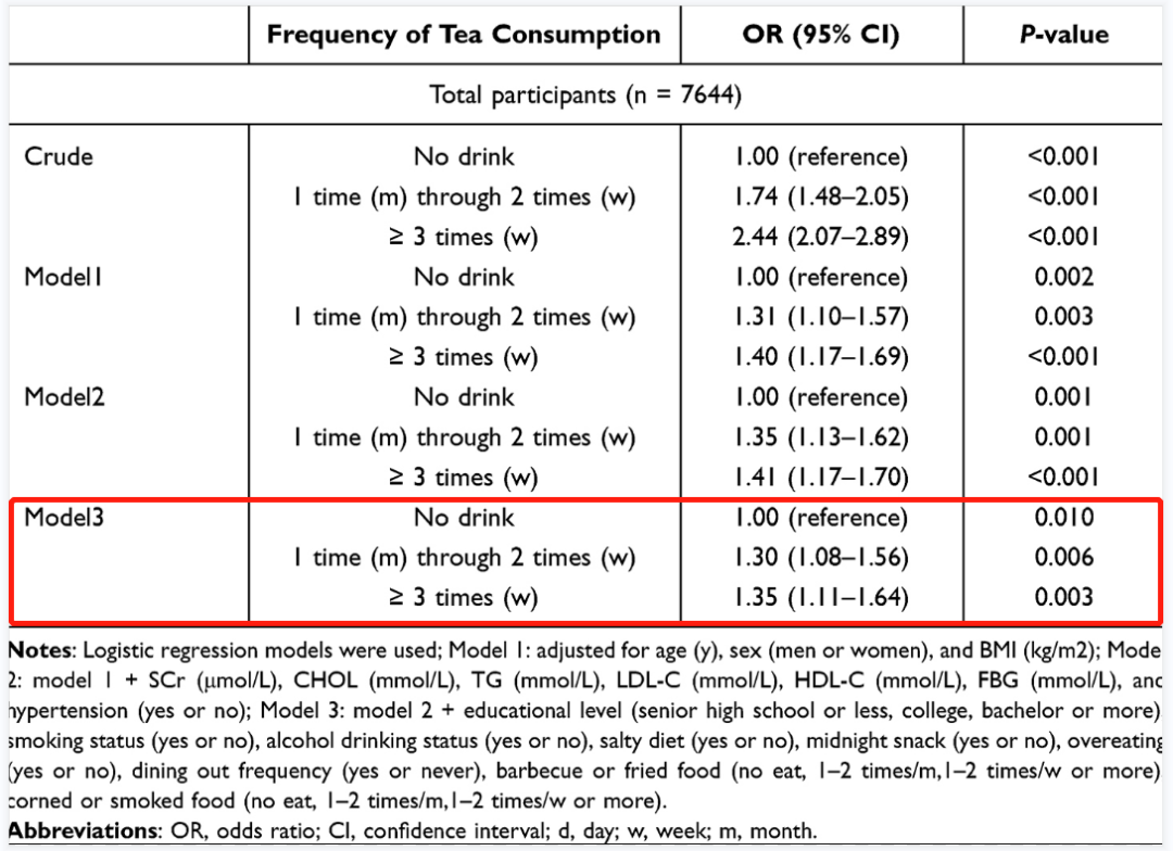 本文通过广东人的喝“茶”,按照不同频率进行分层,同时为排除干扰,分别创建三个模型,依次校对了一般情况(年龄、性别、体重)、生化指标(肌酐、血糖、血脂)、饮食习惯等可能影响因素,最终得出喝“茶”频次与高尿酸血症风险呈正相关的结论。