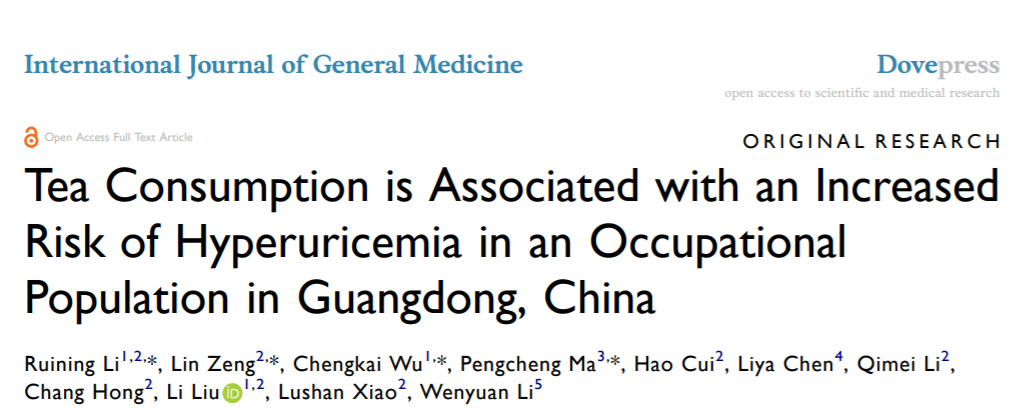 [1] Ruining Li,et al.Tea Consumption is Associated with an Increased Risk of Hyperuricemia in an Occupational Population in Guangdong, China.International Journal of General Medicine.DOI 。[2] 本文首发丨医学界内分泌频道本文作者丨博文采访专家丨南部战区总医院内分泌科主任 李佳责任编辑丨曹前版权声明本文原创,转载请联系授权-End-医学界力求其发表内容在审核通过时的准确可靠,但并不对已发表内容的适时性,以及所引用资料(如有)的准确性和完整性等作出任何承诺和保证,亦不承担因该些内容已过时、所引用资料可能的不准确或不完整等情况引起的任何责任。请相关各方在采用或者以此作为决策依据时另行核查。