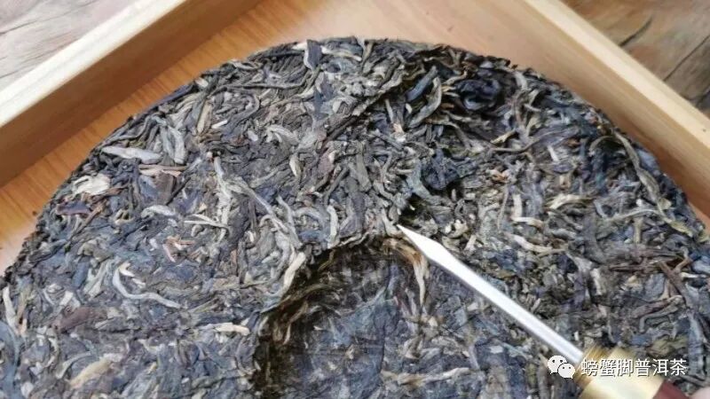 普洱茶在制作过程中,是将叶片分层叠加,放入模具中用重物压制。所以买到的普洱茶饼,一般是均匀的层式结构,只要我们从茶饼较松的地方入手,一层一层地撬动茶饼,就能最大程度的保留茶叶的完整。