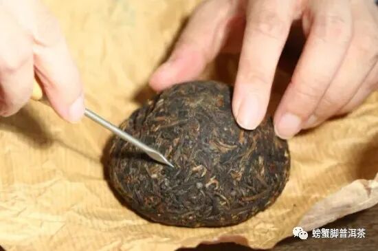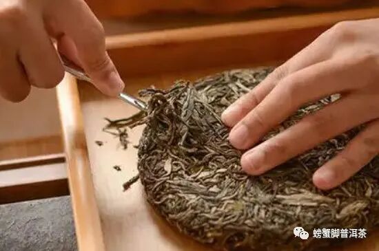 先把普洱茶饼立起来,使用茶刀或茶锥平行于饼面的方向,从边缘缓缓插入,稍微用力将茶饼撬松;撬松后拔出茶刀,从相邻的地方再次插入,将茶轻轻地撬起来;再用同样的方法一层一层撬开茶饼,这样就把普洱茶饼完整地撬散了。