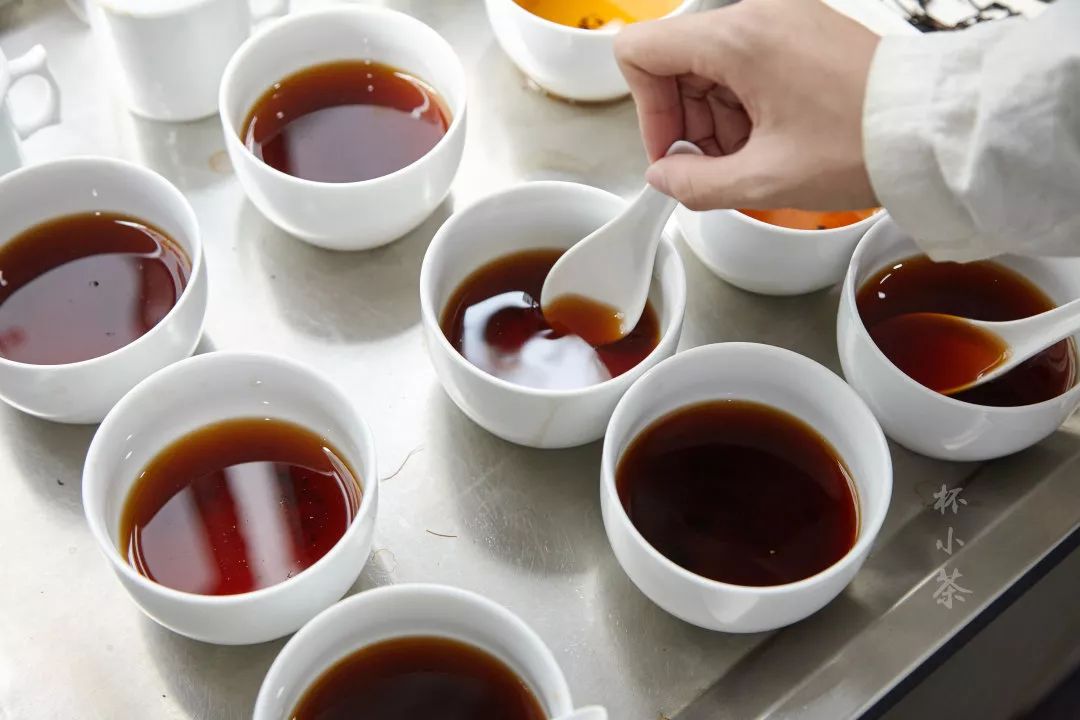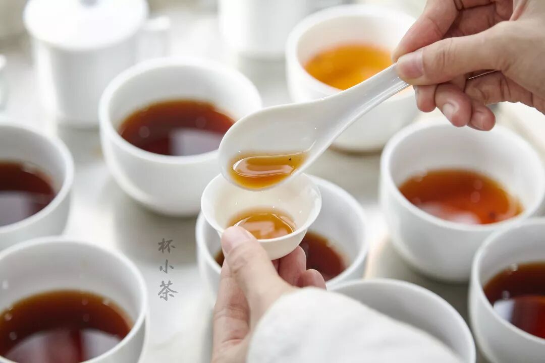 用茶匙在碗中打转一圈,然后按茶汤浓度、亮度、清澈度评定优次。