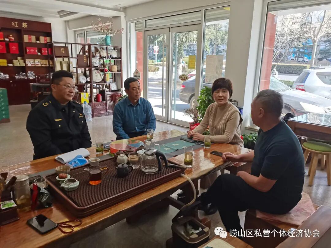 崂山区市场监管局领导、区小个专行业党委书记王春先与青岛崂池云峰茶业有限公司总经理孙志修交流座谈企业发展情况