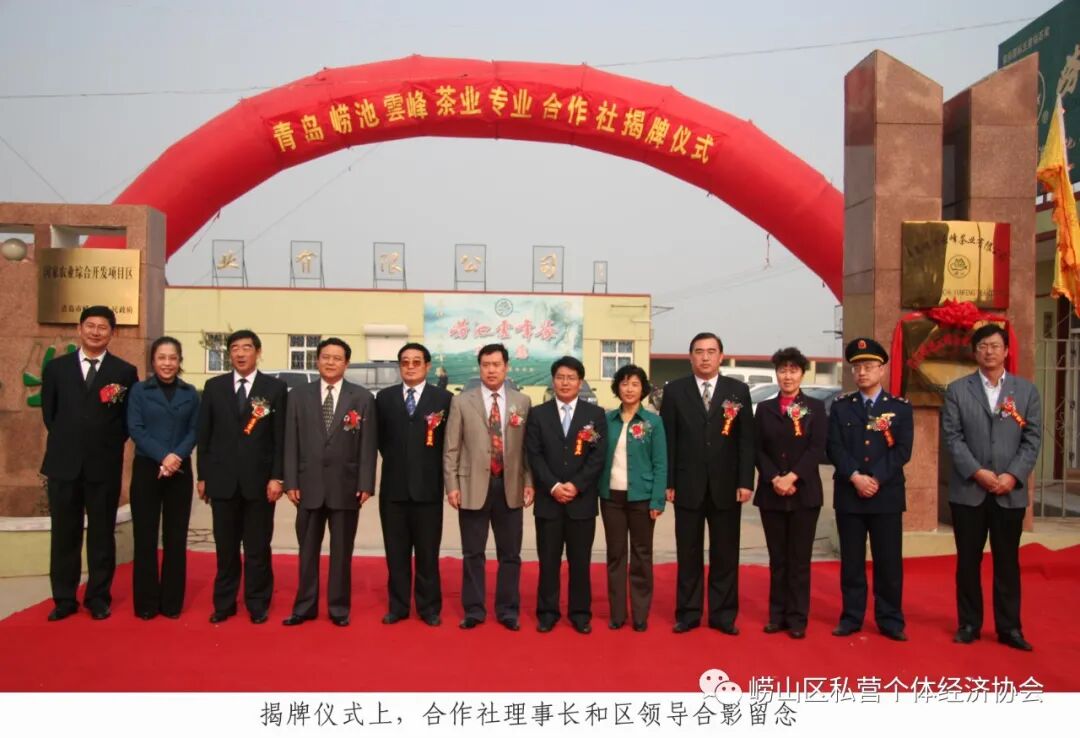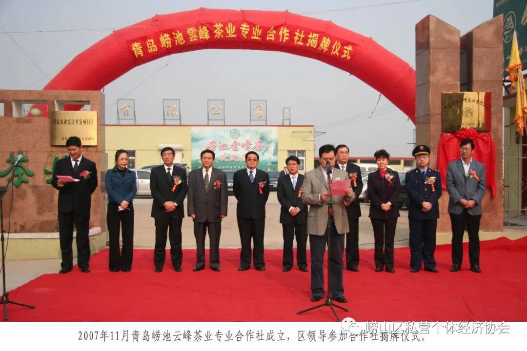 2007年11月青岛崂池云峰茶业专业合作社成立,崂山区有关领导参加揭牌仪式