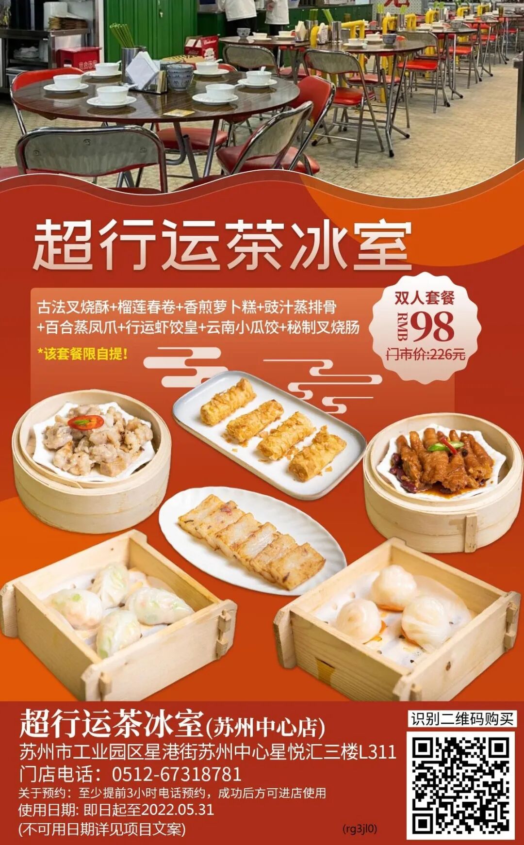 [超行运茶冰室]【自提】苏州中心店|来了!来了!排爆苏州的网红粤式茶餐厅劲爆来袭!98元抢门市价226元双人套餐!行运虾饺皇+百合蒸凤爪+豉汁蒸排骨……丰富菜品!还原地道港式味!【电话预约】