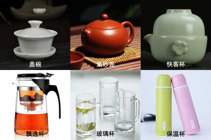 主要有白瓷盖碗、紫砂壶、快客杯、飘逸杯、玻璃杯、保温杯
