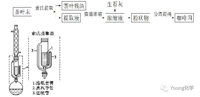 (1)实验时需将茶叶研细,放入滤纸套筒1中,研细的目的是 。圆底烧瓶中加入95%乙醇为溶剂,加热前还要加几粒 。