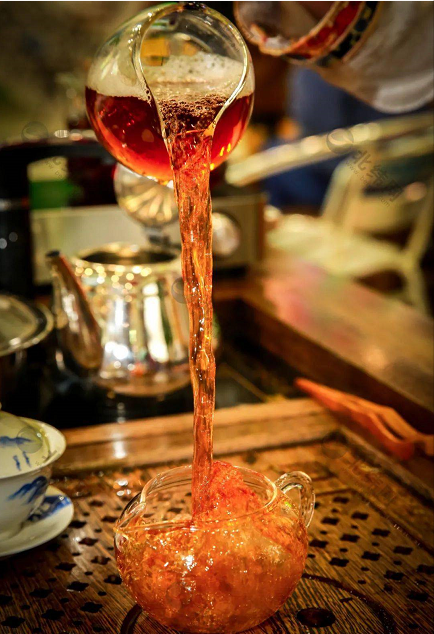 将二十年老料拼制的茶砖冲泡成一杯醇香茶汤。