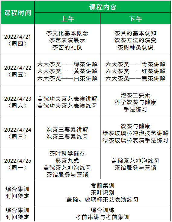 1、系统学习+考证。中级茶艺师5+2(5天系统学习,2天考前集训)