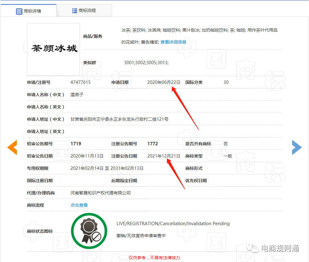 截至目前,申请注册在第32类及第30类上的“茶颜冰城”商标(争议商标)已被核准注册,2021年12月21日注册公告,商标专用权期限截至2031年2月13日。