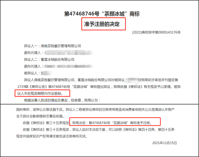 国家知识产权局经审查认为,异议人称被异议人复制、摹仿其引证商标,误导消费者等证据不足;被异议商标的注册使用易造成相关公众混淆误认等缺乏事实依据,“茶颜冰城”商标与“茶颜悦色”及“蜜雪冰城”等商标不构成近似商标。依据《商标法》规定,“茶颜冰城”商标准予注册。